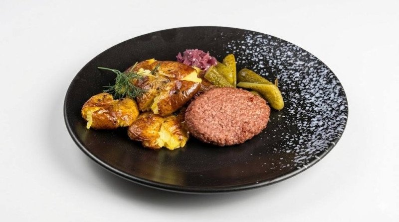 Бифштекс постный, картофель, маринованные огурцы, маринованный красный лук, зелень
