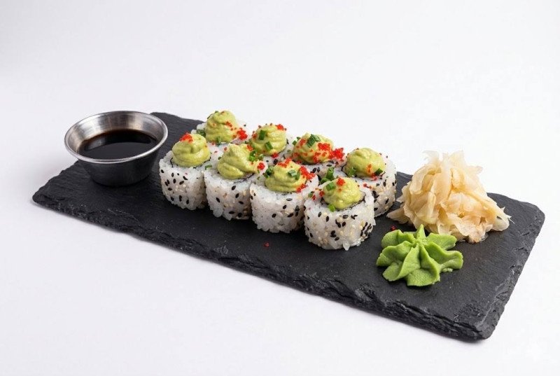 Рис, сом горячего копчения, сыр творожный, кунжут, икра тобико, гуакамолле, имбирь, васаби, соевый соус