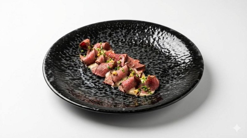 Ростбиф, соус Вителло, зернистая горчица, оливковое масло, лук резанец