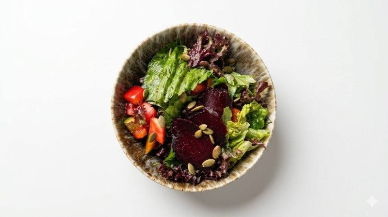 Микс салата, томаты, огурцы, болгарский перец, свекла запеченная, тыквенные семечки, специи, оливковое масло