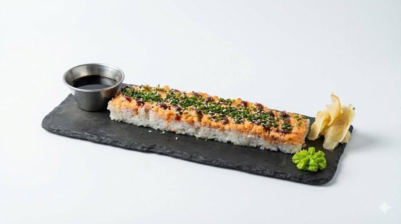 Рис, жареный лосось, творожный сыр Креметте, соус Унаги, лук резанец, кунжут