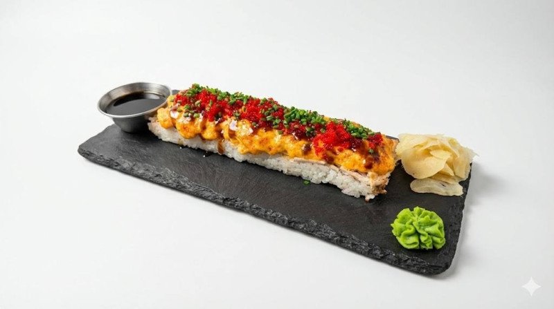 Рис, творожный сыр Креметте, майонез, Кимчи, пармезан, креветки, куриное филе, кунжут, икра тобико, лук, соус Унаги